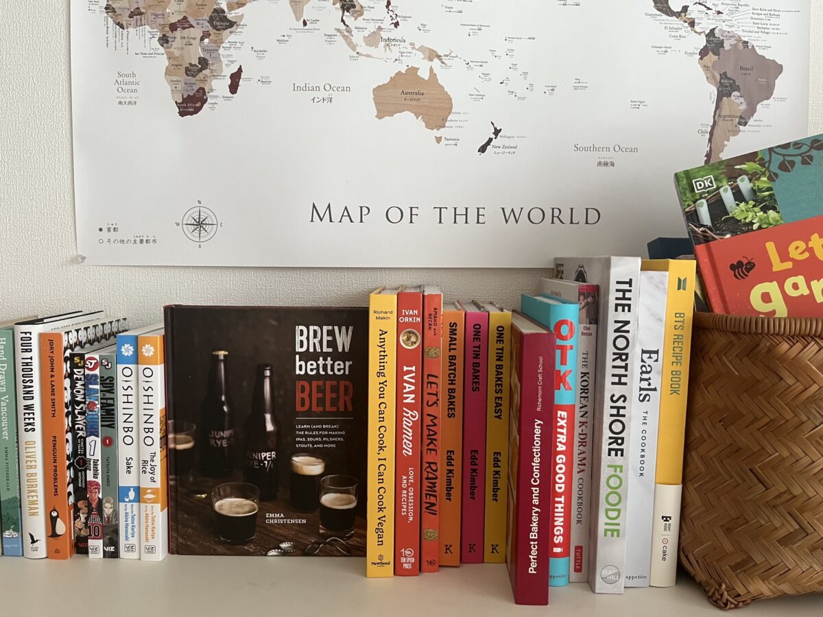 表紙をこちらに向けて飾っている、ビールの作り方本もお気に入り!