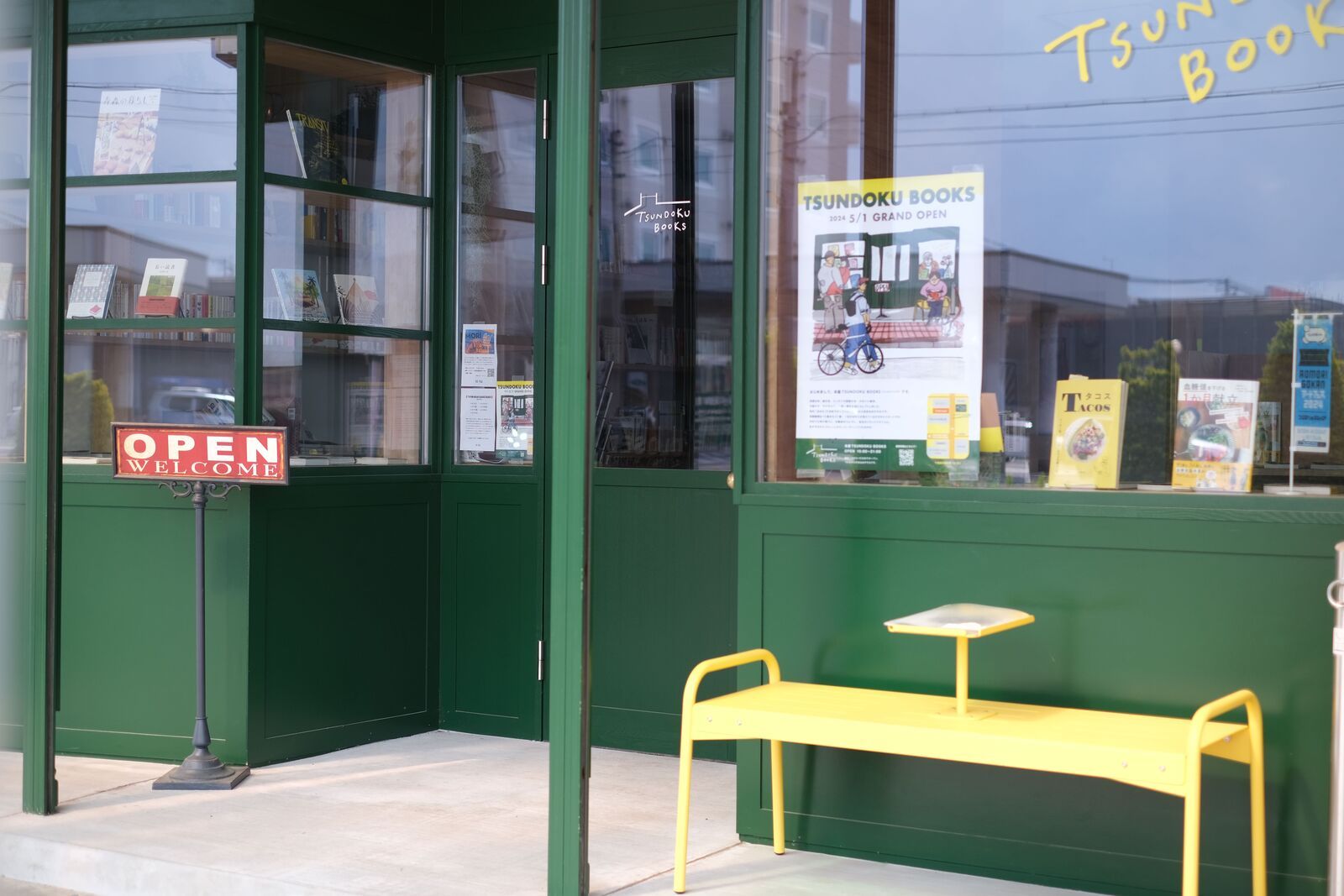 本屋『TSUNDOKU BOOKS』は、青森県十和田市の商店街にあります。最寄のバス停は『官庁街通』と『まちなか交通広場』(それぞれ徒歩30 秒〜1 分)、緑色の外観と黄色いベンチが目印です。